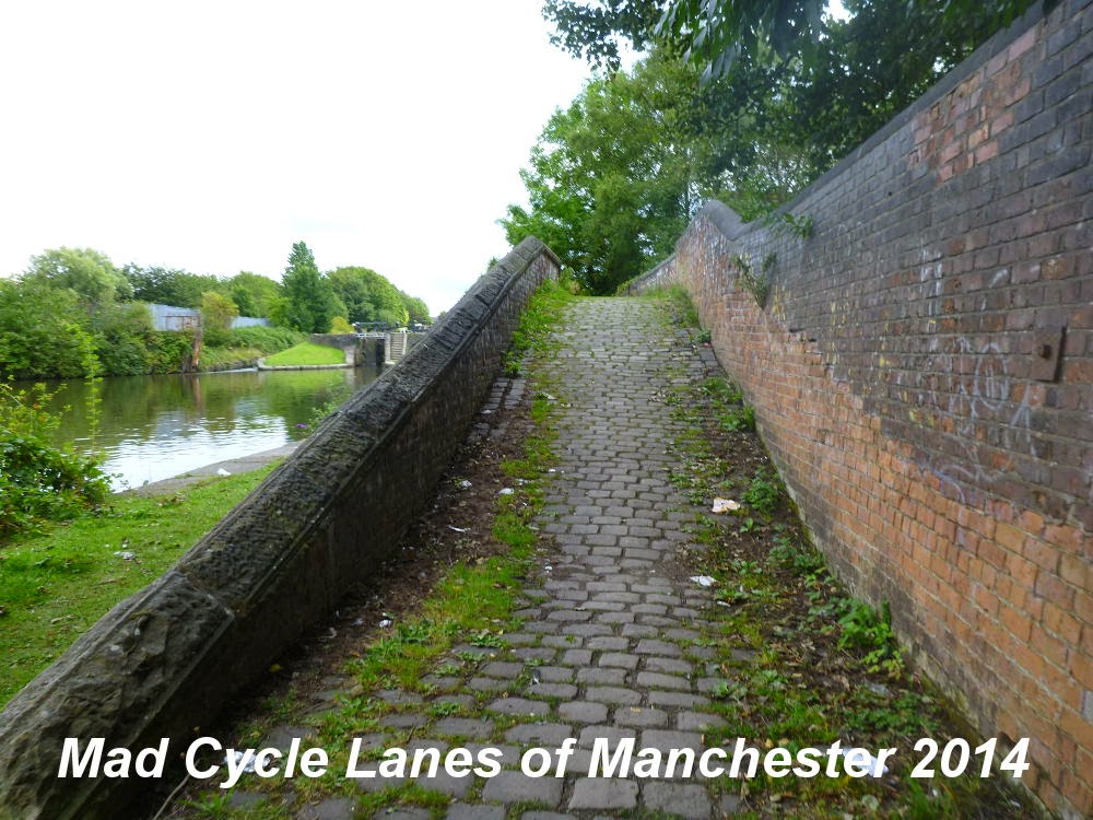 From the signpost with the Stockport Branch Canal cycle route the path goes over the cobbled bridge which goes over the original canal junction.